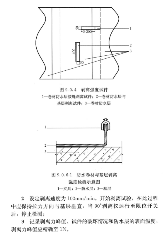 2、卷材防水層與基層剝離強(qiáng)度試件:采用切割工具沿縱向在卷材防水層上切割出長(zhǎng)度為(400±10)mm,寬度為(50±5)mm的試件,并將試件的一端拉起30mm