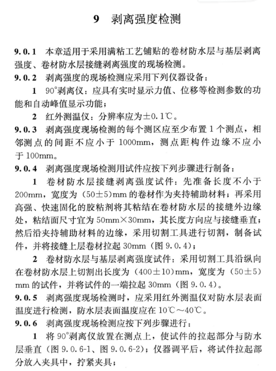 剝離強(qiáng)度現(xiàn)場(chǎng)檢測(cè)時(shí),應(yīng)采用紅外測(cè)溫儀對(duì)防水層表面溫度進(jìn)行檢測(cè),防水層表面溫度應(yīng)在10~40度